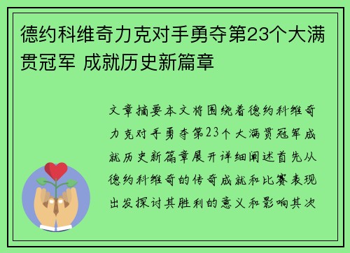 文章摘要:本文将围绕着德约科维奇力克对手勇夺第23个大满贯冠军成就历史新篇章展开详细阐述。首先从德约科维奇的传奇成就和比赛表现出发,探讨其胜利的意义和影响;其次分析他的技术和心态在比赛中的发挥,解析他的强大之处;然后探讨德约科维奇与其他网球名将的竞争和差异,展现他的独特魅力;最后总结全文观点,对其胜利进行归纳与评述。